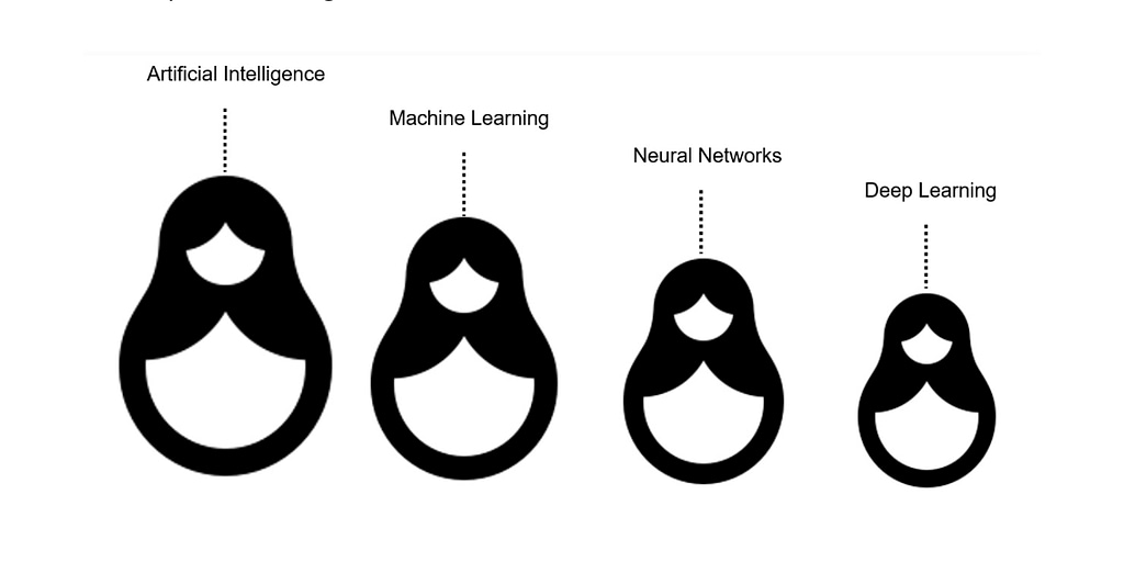 In preparing this video, I created this vocabulary sheet as a starting point for our discussions. I hope you also find this helpful in building your understanding of what makes machines “intelligent” and how they might “learn.” According to IBM, a leading AI innovator in the corporate sector with close ties to MIT research labs in AI, it is useful to visualize the hierarchy of these 4 key AI concepts as nesting dolls: